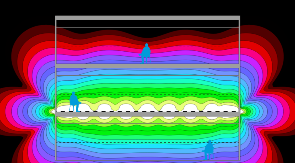 Hearing loops create a magnetic field that is fairly consistent within the loop but reduces the further away from the loop you get. Outside of a simple rectangular loop an audible signal as far as 4 times the width of the room away from the loop can be heard, shown in Figure 1 below. This unnecessary or unwanted magnetic field is known as spill or overspill. The field created also emanates vertically by approximately the same distance, as shown in Figure 2. If another loop system is used within this ‘spill’ area the systems will interfere with each other.